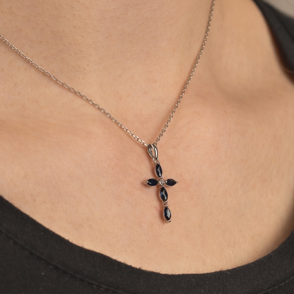 Balto aukso pakabukas su deimantais ir safyrais "Kryželis" - Pakabukai su brangakmeniais - Goldinga